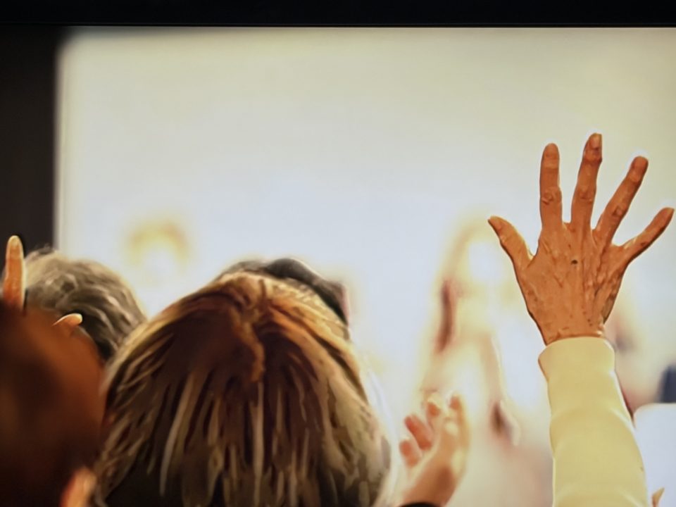 後半賛美は、ペテロ真境名さんリード。歌詞も大きく映します。