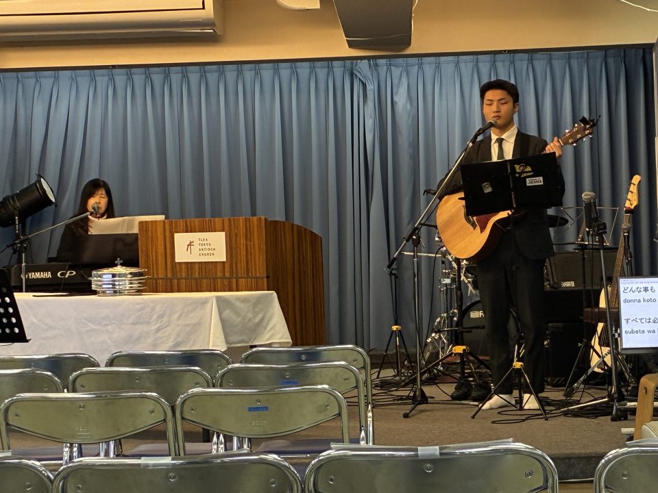 賛美リードは萱野さん、今日は弾き語り、コーラスはダビデくん。