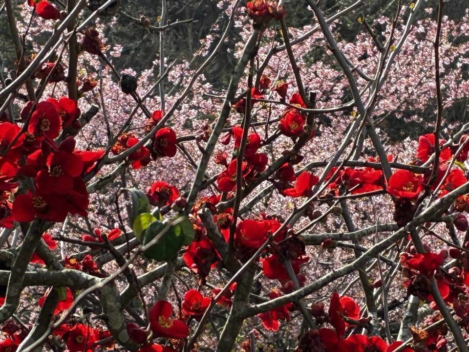 今日は一日雨予報です。まとまった雨になって、春が着実に来てるなと感じます。河津桜の種類だと思いますが、ボケの花とのコラボ、綺麗です。